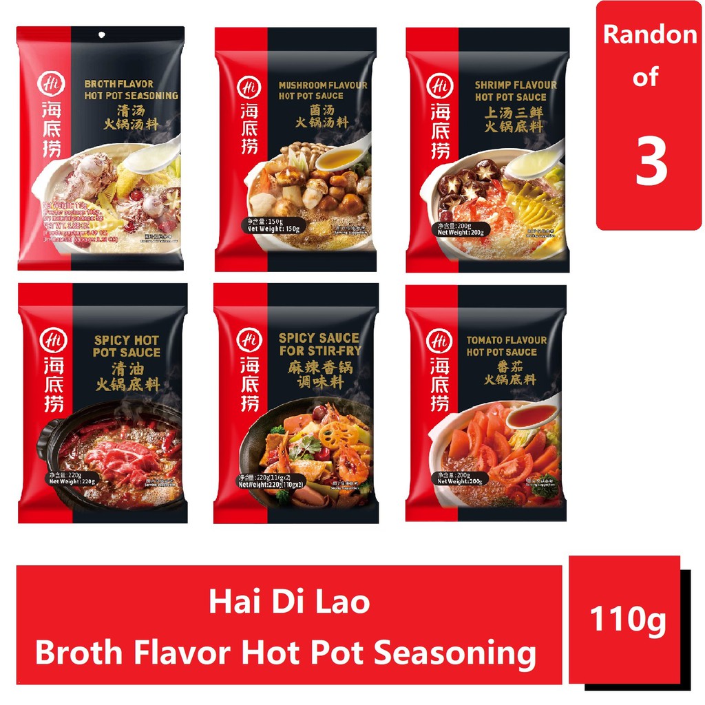 Hai Di Lao Steamboat Soup Base Hot pot soup base / 海底捞 (Bundle of 1 & 3 Hai Di Lao Hot Pot Base These hotpot seasonings can be ordered. haidilao spicy hot pot sauce 220g ; selected sichuan pepper, pepper and spices raw materials are served to make real sichuan hot pot with process of traditional. haidilao mushroom hotpot soup base.the soup base is the soul of a hot pot. cooking hotpot at home using haidilao hotpot seasoning/incredients. . Hai Di Lao Hot Pot Base.
